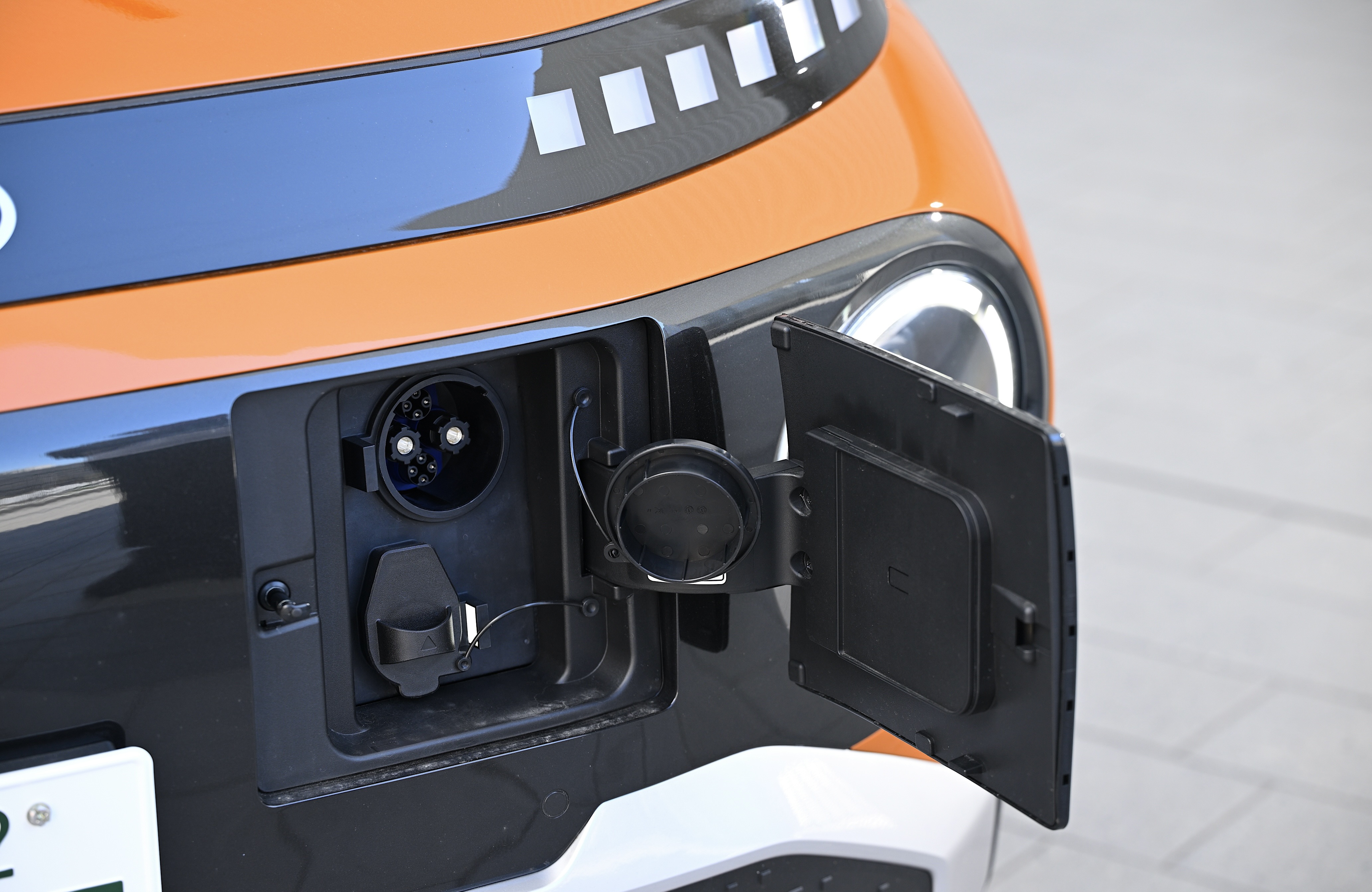 航続距離はエントリーグレードの「Casual」が427km、上位グレードの「Voyage」「Lounge」はいずれも458km。V2Hには全グレードが対応しています。なお、充電口は上の写真のように、フロントグリルのナンバープレート脇に設置されています。